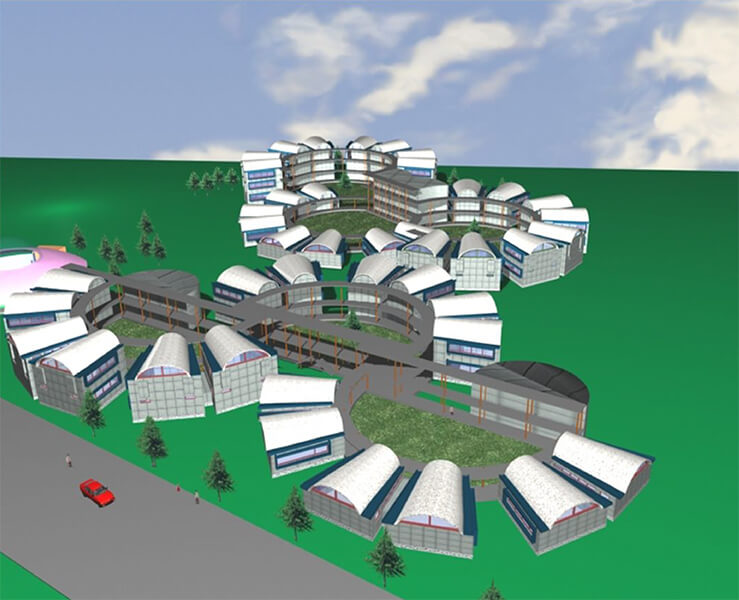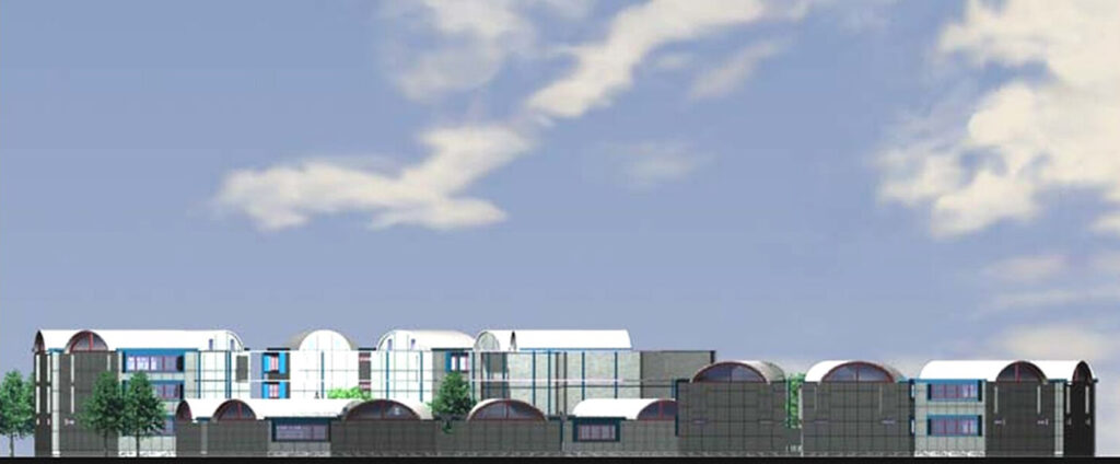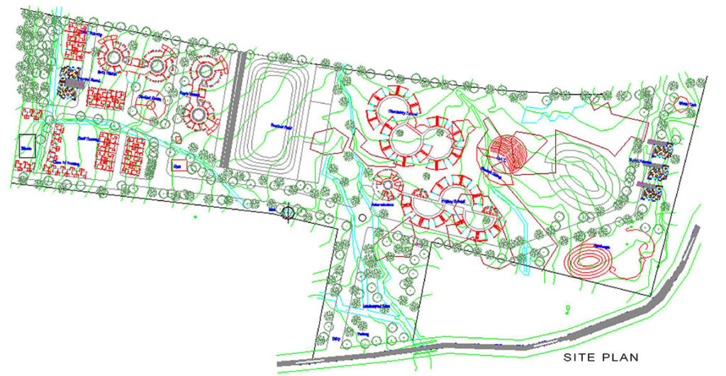 Barrel Vault roofing system over classrooms is used as a primary design element to give the school distinctive look & feel. a The classrooms are arranged around a courtyard in semicircular fashion, thus giving each classroom block ample direct light & ventilation while maintaining proper privacy for teaching.