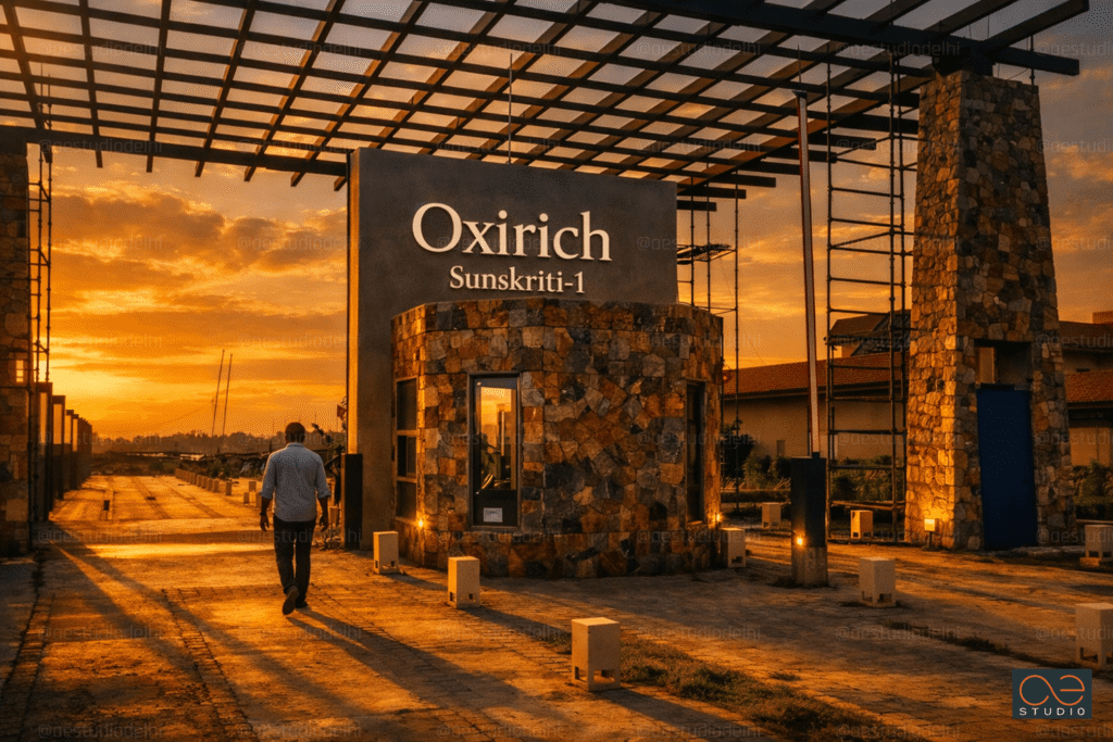 The Unifying Idea Oxirich Sunskriti-I is proof that high-density and high-quality are not mutually exclusive. The staggered towers break the sky. The podium green cools the ground. The 1-BHK studios offer efficiency; the 2-BHK edge units offer views. And the wing-like crowns—lit against the night sky—remind everyone passing on the Bhiwadi-Alwar Highway that this is not just another housing complex.